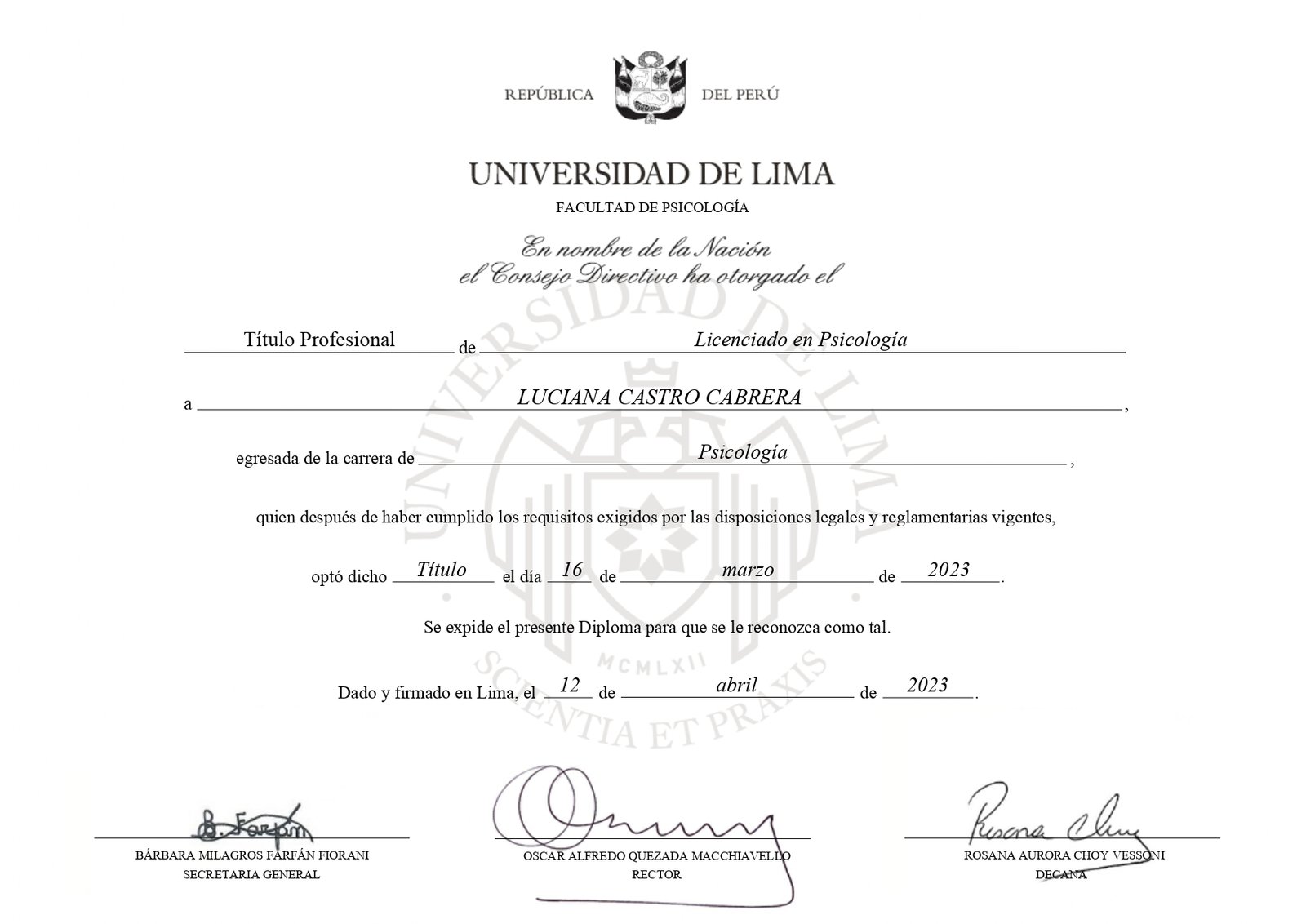 Me licencié en Psicología en la Universidad de Lima para seguir mi verdadero sueño: comprender y acompañar mejor a otros, y también a mí misma.